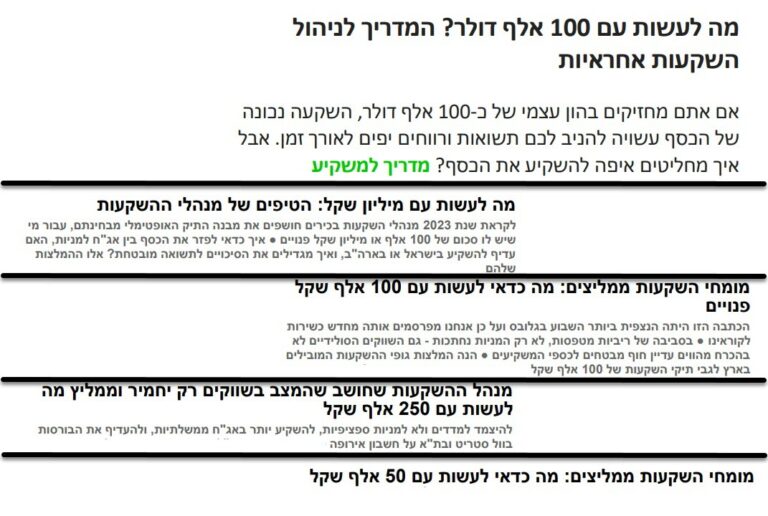 כותרות מרעישות מופיעות בעיתונות הכלכלית חדשות לבקרים: מה לעשות עם 100,000 שקל/דולר, 250,000 שקל, מיליון שקל…. מסתבר שאילו הכתבות הנקראות ביותר, ולכן לא פלא שהן